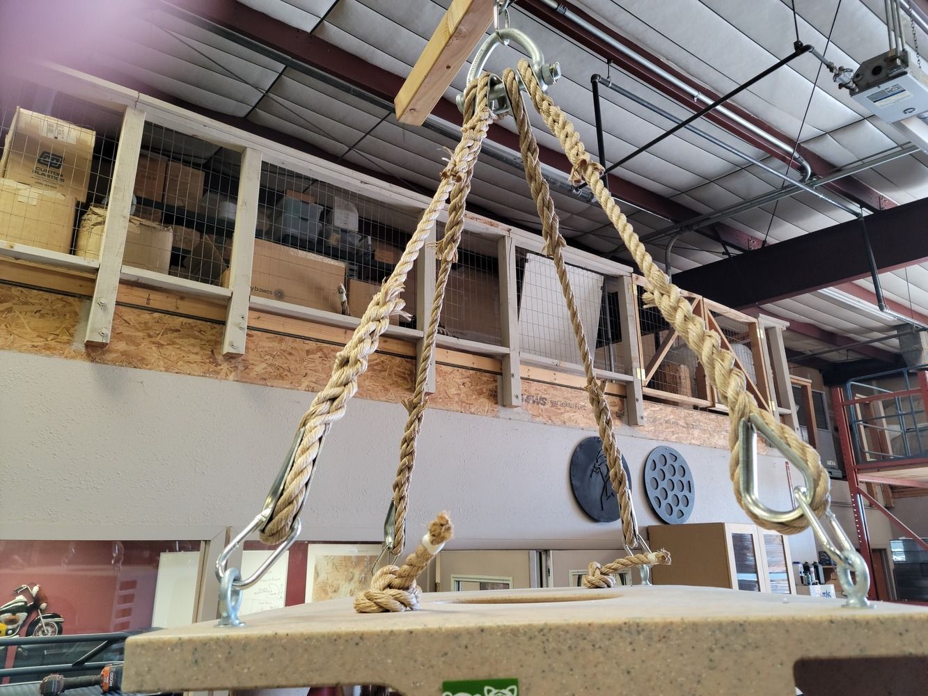 - Rope Swing at bottom is 25 feet of 1” Pro-Manila Rope; both ends are knotted to floor to allow a large range of field adjustability. Both ends are “End Whipped” to eliminate fraying.
