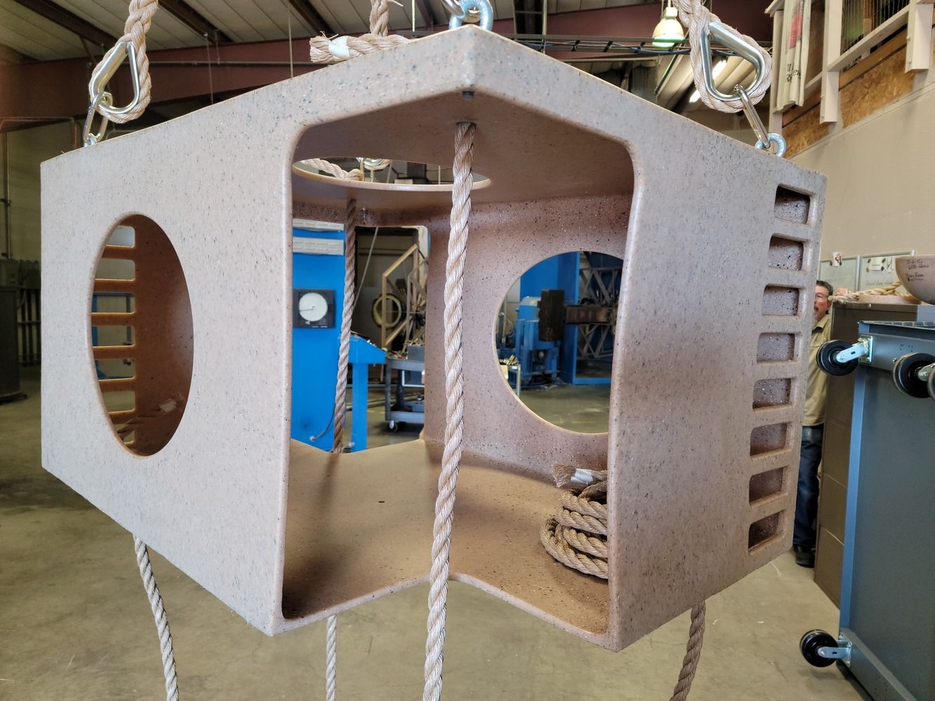 - Traditionally, the unit is suspended from (4) high-strength machine-grade Eye Bolts; (1) in each corner. From each Eye Bolt, a Carabiner attaches to a rope utilizing a metal Thimble which further strengthens the interwoven Eye located on the 48” of 1” diameter Pro-Manila Rope. At the other end of this rope, a similar Thimble / Eyelet is used. This end, as well as the other (3) Hanging Rope ends are attached to a single Lifting Shackle to allow a single-point attachment at your facility.